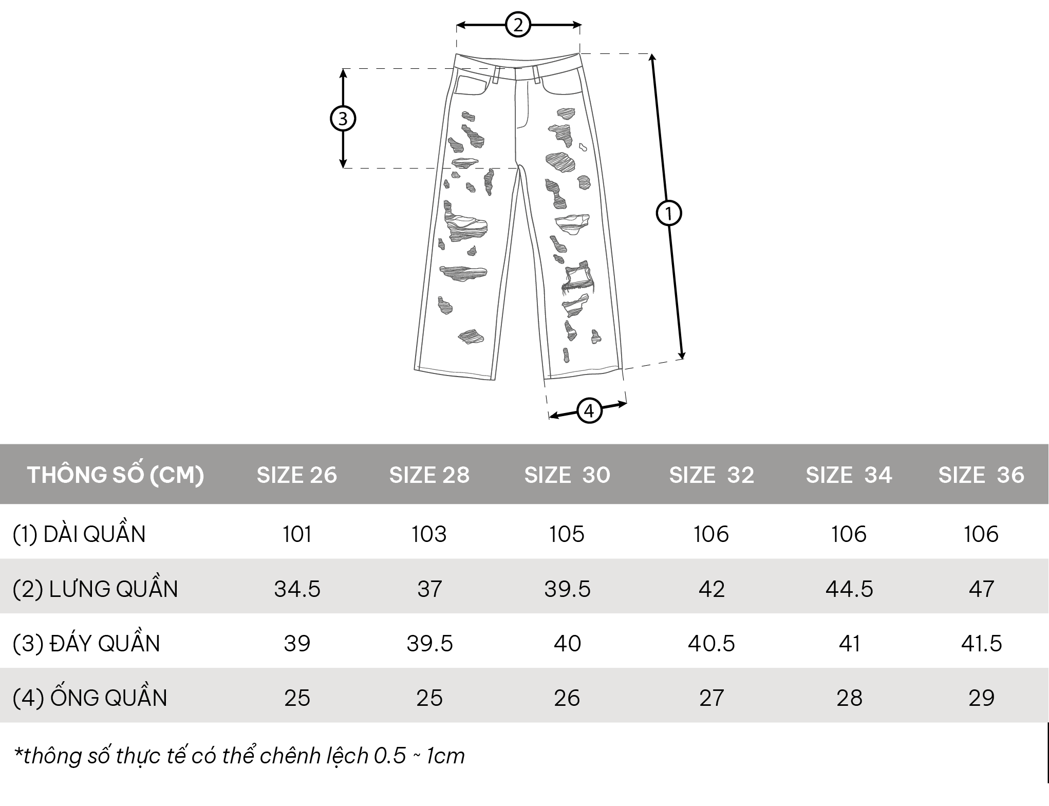 • Kích thước: 26 - 28 - 30 - 32 - 34 - 36